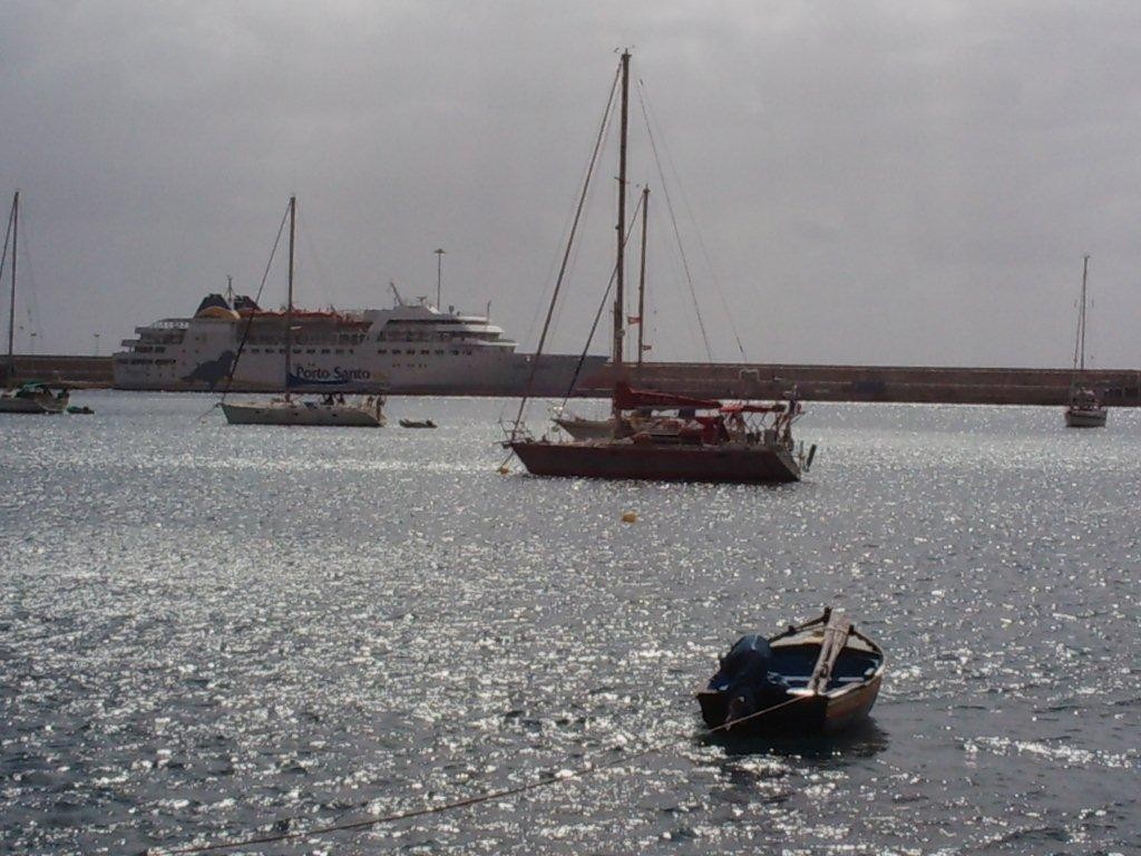 PIC_0117.jpgA 10h30 le 7 : ‘’Terre en vue à bâbord !’’ et arrivée à midi à Porto Santo à midi avec un vent à décorner les cocus qui nous a bien donné du mal à jeter l’ancre qui ne tenait pas sur le fond pour finalement prendre un coffre (bouée avec  au bout un gros cordage relié à un gros machin lourd au fond de l’eau). Depuis le vent n’a pas arrêté de souffler, ça siffle dans les haubans mais ce bruit ne nous a pas empêché de dormir 12 la nuit dernière !