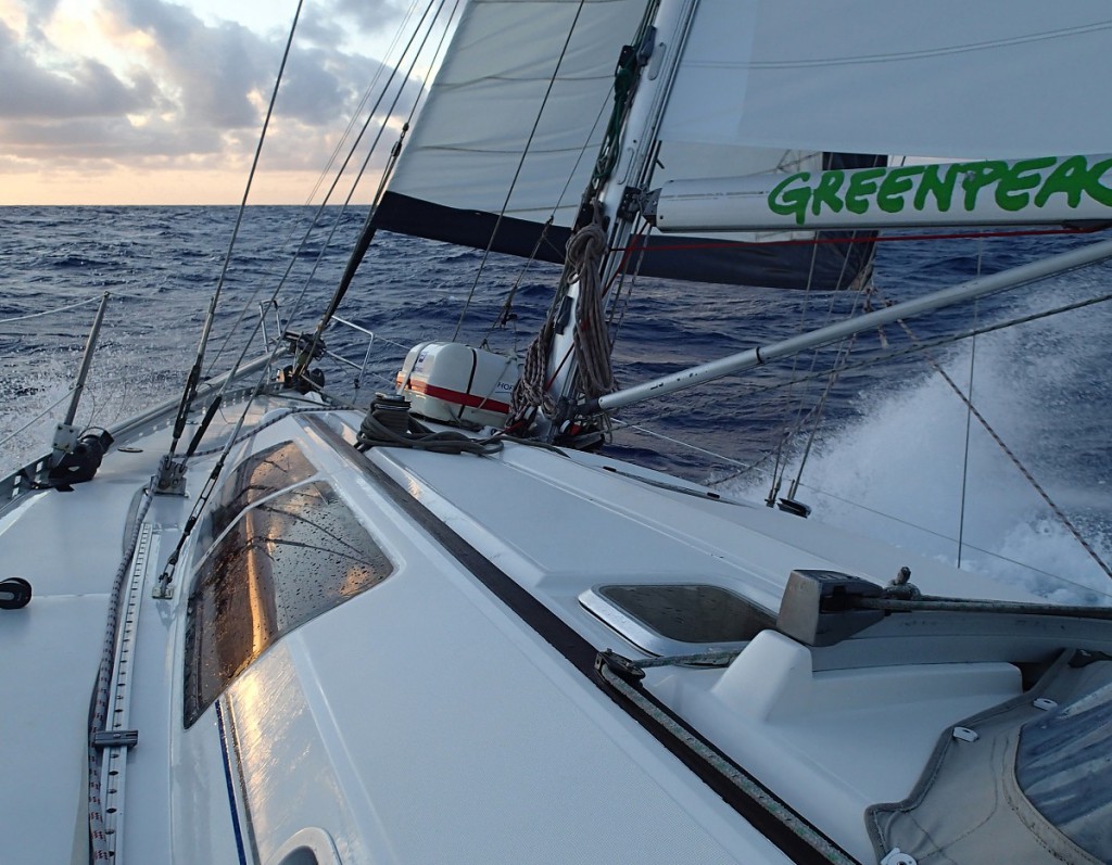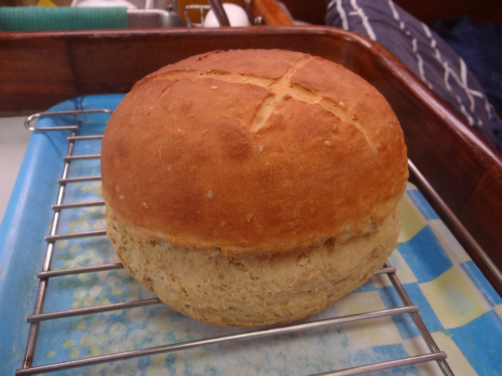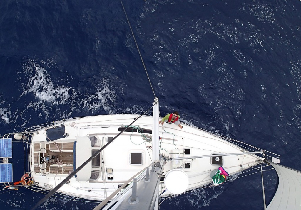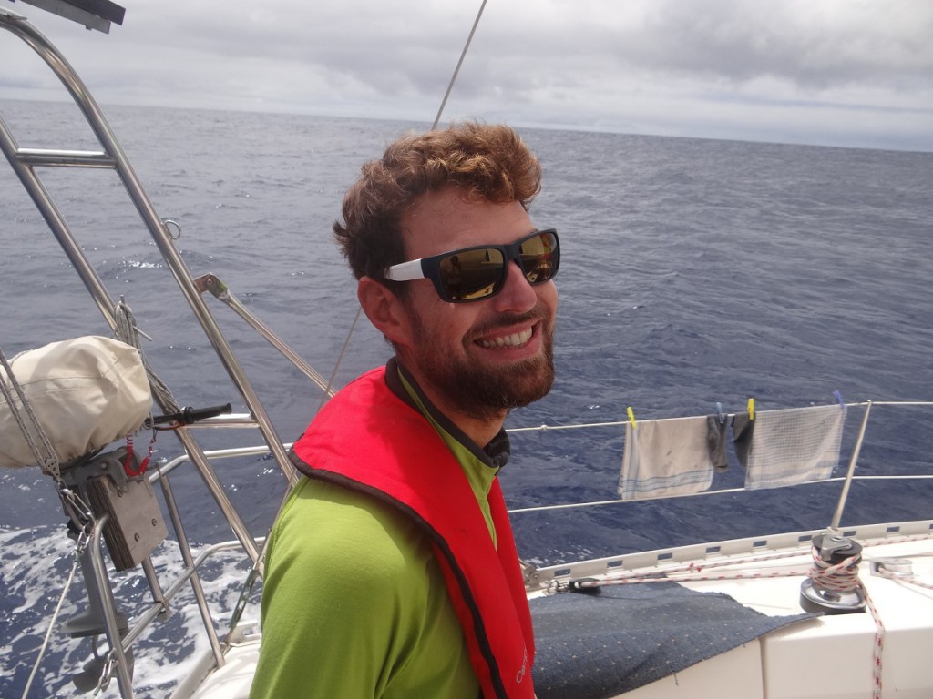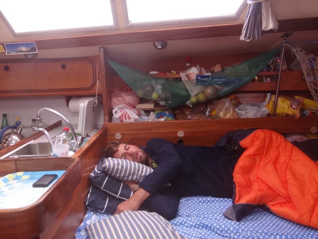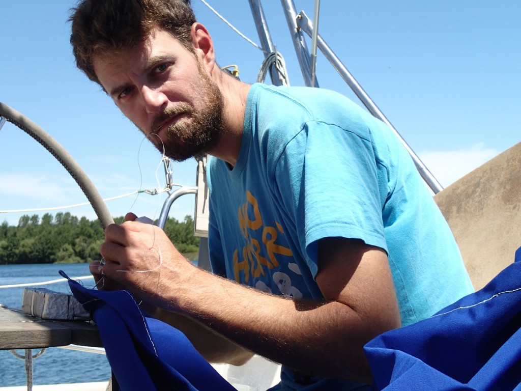 Le sauvage local (en train de coudre un bimini anti-pluie) :