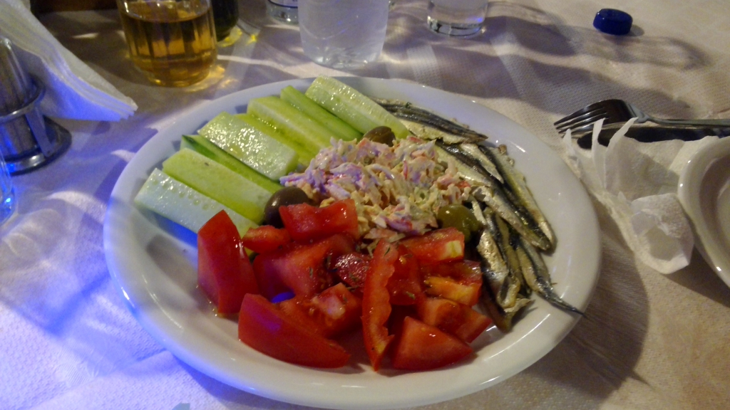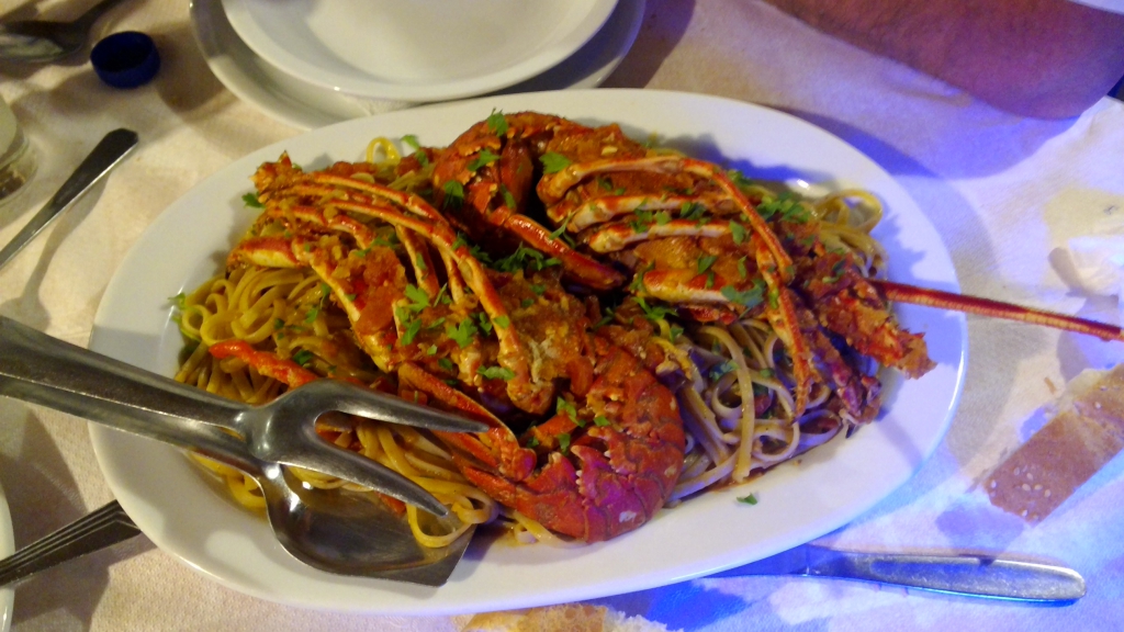Ce soir donc, diner langouste, pour la premiete fois en méditerranée. Que buvons nous ? Du ouzo bien sur! Et en entree le chef nous offre une assiette de crudites et anchois marines. L'ile a une forte culture italienne, la langouste est donc accompagnee de spaghettis aux tomates marinees. Tres bonne soirées, on oublie le vent...