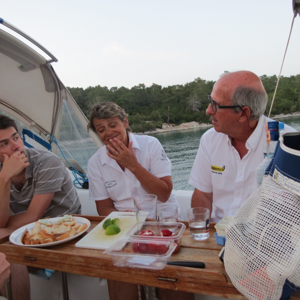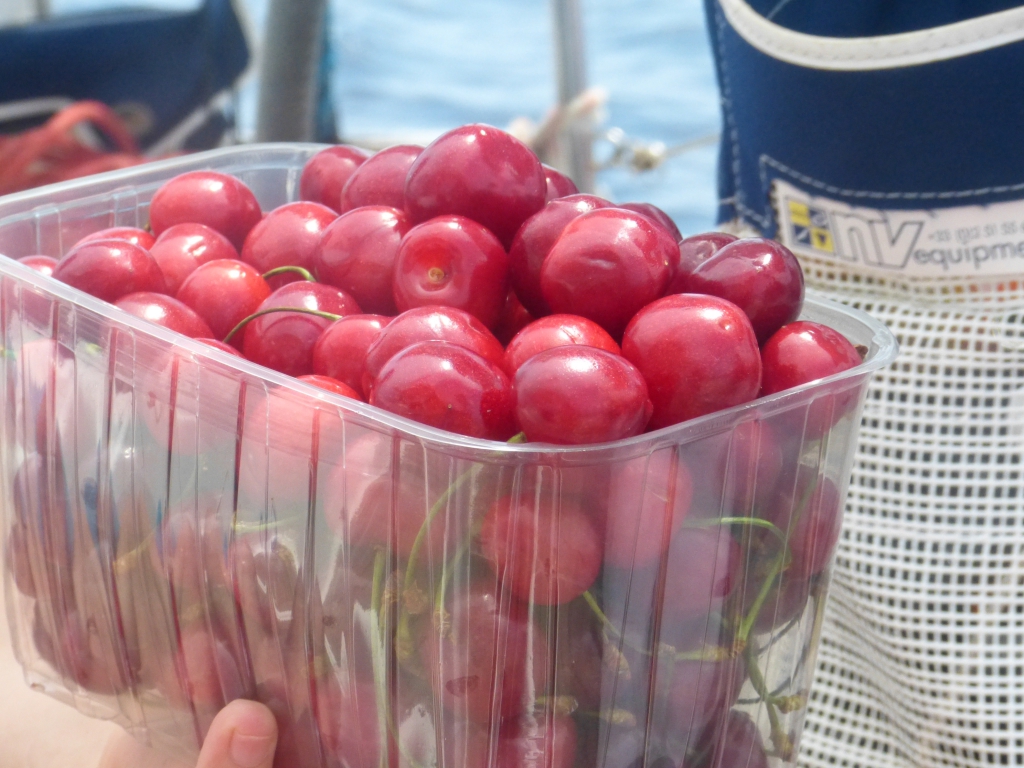 Nico investit la cuisine, il nous prépare une super salade. Complétée par des cerises bien rouges et bien sucrées, le déjeuner a l'approbation de l'équipage.