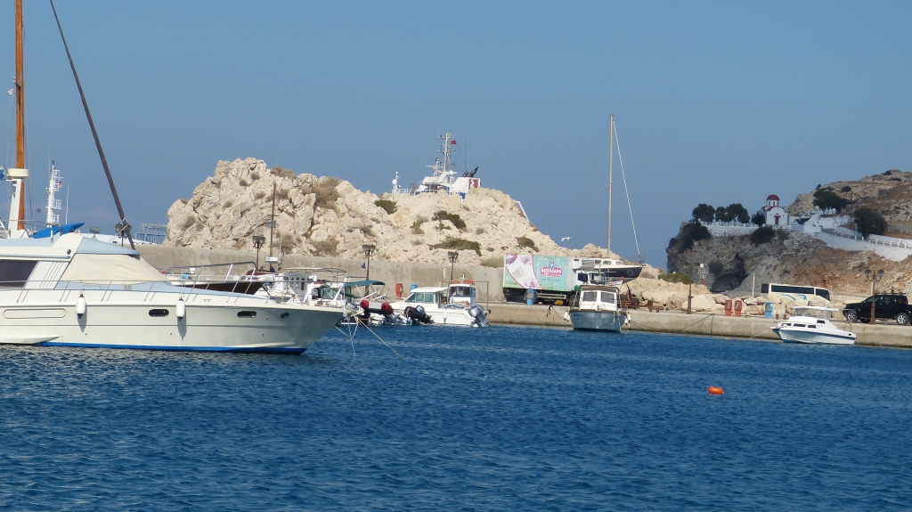Lever à 7h, nous avons 56 miles à faire donc départ juste après le petit déj, ce matin il n'y aura pas de bain, dommage !!! La chaine semble vouloir nous retenir ici, manoeuvre intelligente de l'équipage facilitée par l 'eau translucide et ça y est nous sommes libérés. Le vent se lève, 12 nd nous faisons 1h de voile et puis, brutalement à la pointe de l'ile de Rhodes, le vent tombe et passe du 330 au 230. Puis il remonte, 20 nd, 25 nd nous prenons 1 ris puis le 2ème, on avance à plus de 7 nd, c'est royal. Mais le vent est capricieux, il retombe, nous lachons les ris et mettons le moteur. La mer est belle entre les 2 iles, pas de houle, grand soleil, tout va bien. Le vent revient, 12h30, nous croisons un cargo qui change de cap pour nous éviter, merci au "SHEBELLE". 15h, nous arrivons devant PIGADHIA, la capitale. Nous allons faire un tour dans le nouveau port, juste un quai en béton, un peu désert, un peu isolé... nous tentons le vieux port. Le long des cafés et des tavernes, un grand quai en béton et un bateau anglais ammaré. Nous nous mettons derrière lui. Eau et électricité sur ce ponton, que demander de plus ? Ce n'est pas le tourisme qui défigure cette petite ile un peu oubliée, la dernière ile au sud du Dodécanèse. Demain, nous pensons passer la journée ici, je vous en dirai donc un peu plus ...