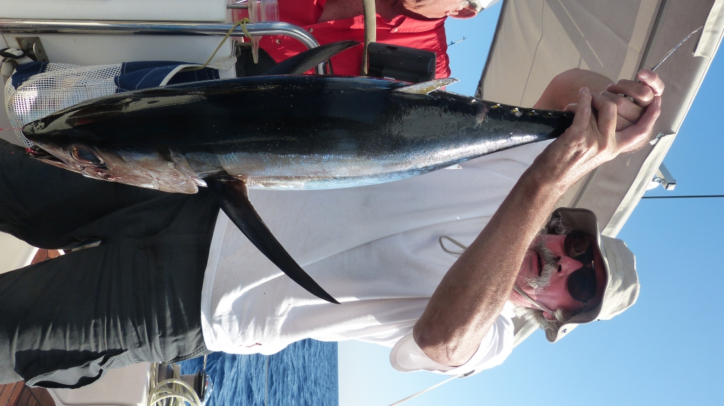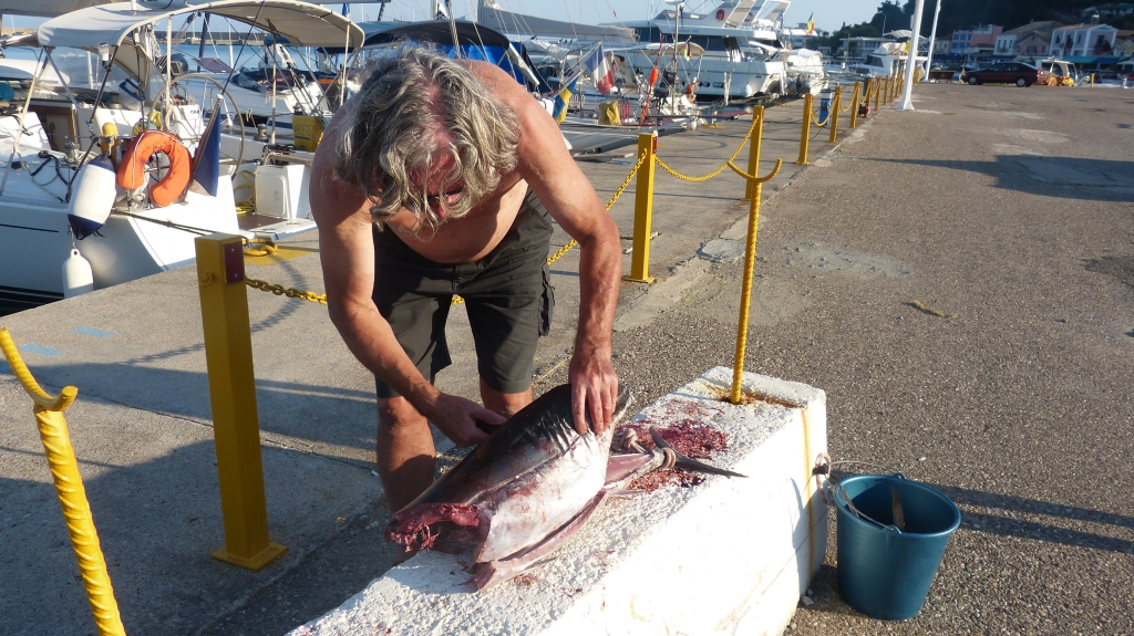 Hier soir, nous sommes entrés chez le ship juste pour voir. A peine entrés, il nous offre une bouteille d'huile d'olive de "sa" production et un verre de jus d'orange. Sympa ! Dans sa boutique il vend de tout et en particulier des rapalas. Il nous fait l'article pour un beau poisson rouge et blanc, le meilleur pour la peche au thon.... nous l'achetons. Ce matin, une longue nav nous attend,50 miles. Gérard était chargé de nous réveiller. A 7h30, il sonne le clairon mais avec des croissants de la patisserie française. Nous sommes quand meme en Grèce donc il sont au nutella et enrobés de meil mais tout petits. Nous avons quand meme un très bon équipier !!! Si les nuits sont enfin plus fraiches, dès que le soleil brille, les températures montent. A 10h, il fait déjà 29°8. La mer est plate et pas un souffle de vent, encore et encore du moteur. Au menu du déjeuner, ratatouille maison et normalement du thon. Nous avons mis la ligne dès 11h. Mais si la ratatouille était délicieuse, le thon était absent. Par contre à la fin du repas, le vent arrive, 13nd dans le 264. Nous mettons toutes les voiles et arretons le moteur. Nous filons à 7nd ! 16h, la ligne s'emballe. Gérard commence à récupérer le fil, nous mettons le bateau en panne et pendant 40 mn, la bete se débat. La voilà... c'est un thon de 87cm et 9,5Kg (maintenant nous sommes équipés pour la pesée). C'est notre record sur Somalove ! le dernier était de 74 cm ! Deux heures plus tard, nous arrivons dans le port de Katakolon. Le marinero qui nous accueille repère notre pêche, ainsi que les autres plaisanciers. Gérard s'installe sur le quai pour le débiter en filets.... son succès est immédiat. Nous faisons profiter les uns et les autres d'un morceau de poisson frais. Pour nous, c'est nettoyage du bateau. Pecher c'est sympa mais c'est cause de bien des saletés. Une bonne douche et pour le diner, le chef nous annonce : tartare de thon accompagné d'un riz pilaf. Sans oublier le tipunch en aperitif. Une demi journée à la voile et une peche miraculeuse, cela se fete ! demain petite nav vers l'ile de Zante. Katakolon : 37°38N/21°19E - A 18h il fait 31°7 et la mer est à 24°8 bonne soirée à tous Annaïck photo prise par Gérard au petit matin, le port de Pylos