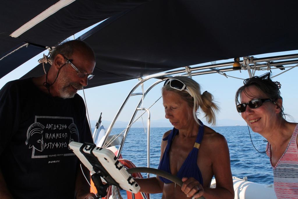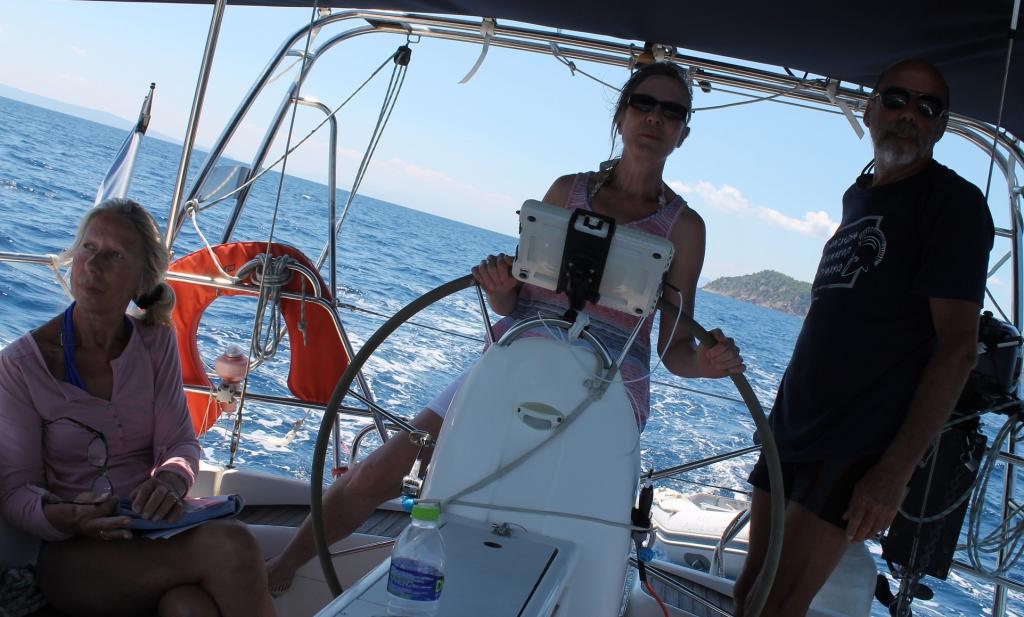 Chacun s'essayant à la barre et aux manœuvres entrecoupées de données techniques sur la navigation et les essais de nœuds sur les bouts... du pain sur la planche pour les novices fraîchement embarqués mais motivés !!