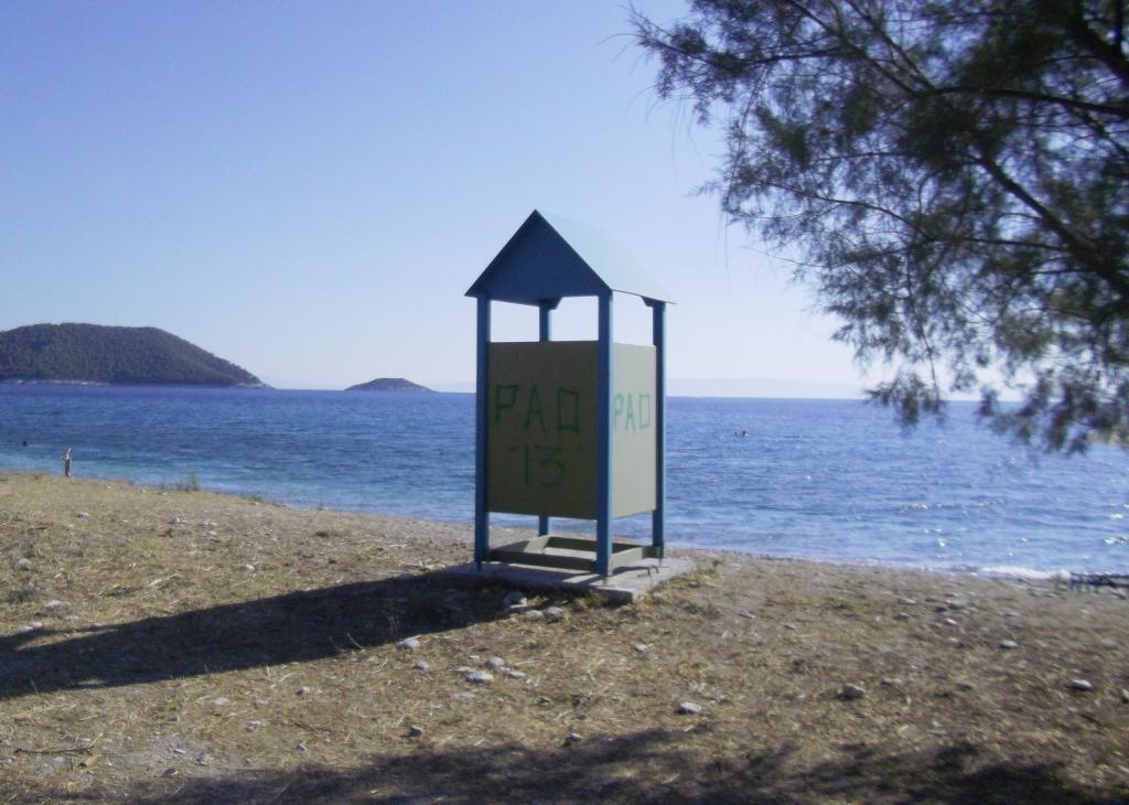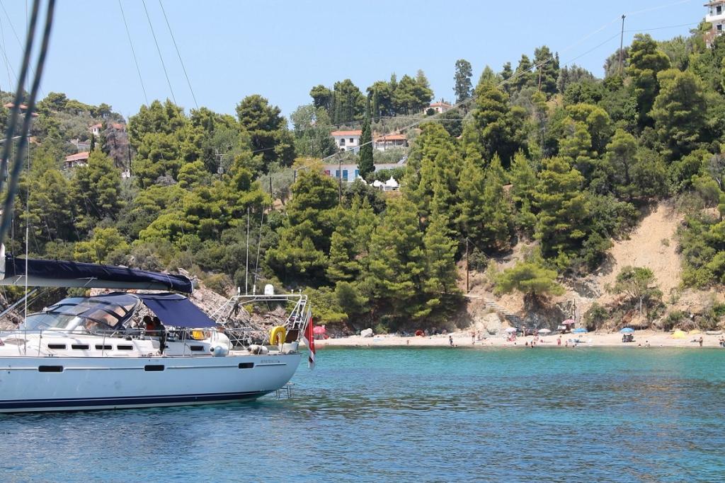 Mouillage prés de la plage de Staphylos- Arrêt déjeuner juste devant les parasols et chaises longues étalées sur la langue de sable, une bonne baignade autour du bateau nous rafraîchira avant de reprendre la mer...