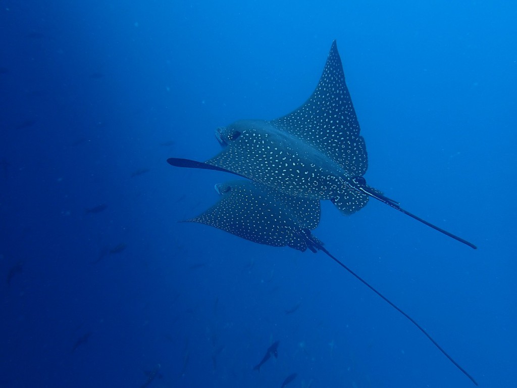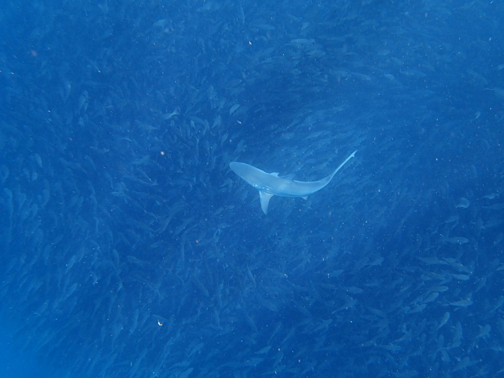 ... par le requin des Galápagos ; quasiment 2m quand même. Quand il passe tout près, il n'a pas l'air d'avoir faim, mais quand soudain on le voit foncer dans le banc, on comprend qu'il ne faut pas lui faire confiance !