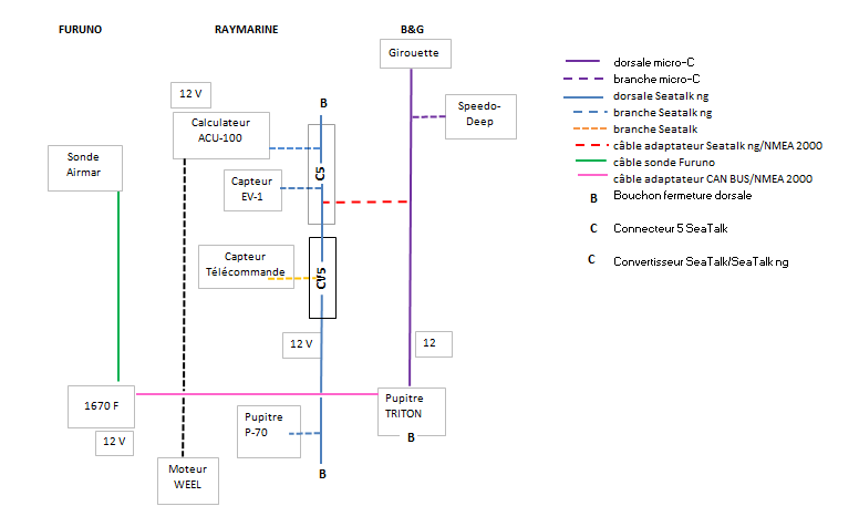Ci-joint un schéma réseau pour associer un piloteRaymarine EV 100 + Weeel Drive avec kit Triton Wind B&G et GPS traceur Furuno