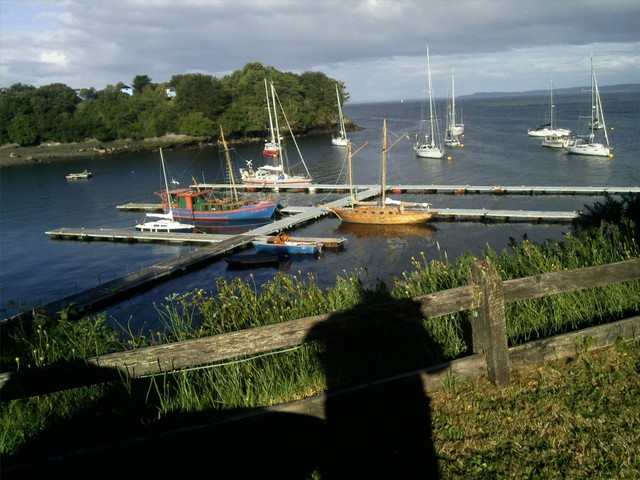 Amarrés (bien cher...) au ponton de la marina Quinched à 5km de Castro, île de Chiloé. Endroit magnifique mais on a encore dû batailler ferme toute le fin de journée (vent de face y clapot) après un départ dès potron-minet du Sud del'île où nous avions trouvé repos hier soir (Puerto San Pedro) après nos 360 milles depuis Caleta Connor au milieu du canal Messier.