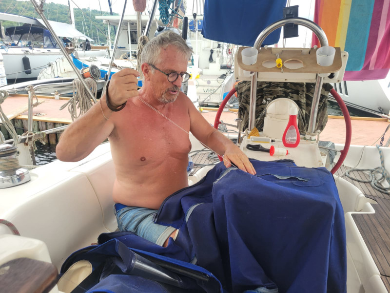 Petit incident : Xavier s’ouvre le crâne sur l’étrave de l’annexe de Patrick. Beaucoup de sang, puis un crâne rasé et sept belles agrafes ! Avec sa peau tannée, il a vraiment l’air d’un pirate.