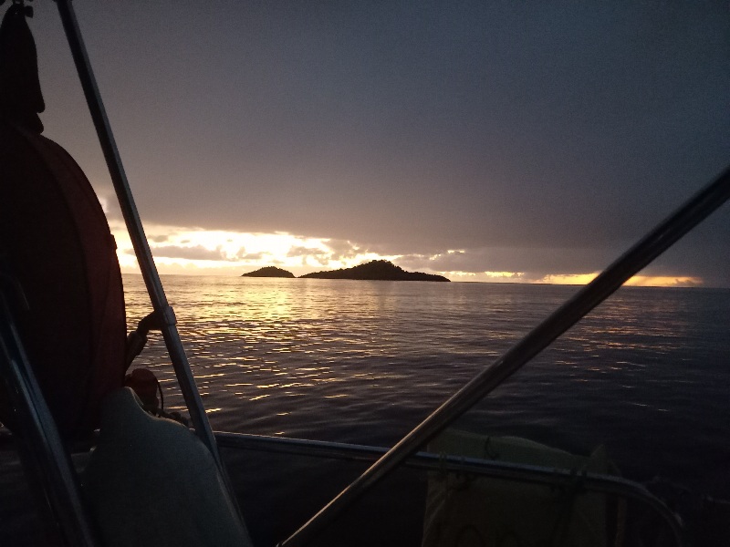 Je mets le moteur. Pas question de louvoyer la nuit dans la baie qui a pas mal de récifs. Je suis le chenal. Avec le vent et la mer, j’avance à deux nœuds.