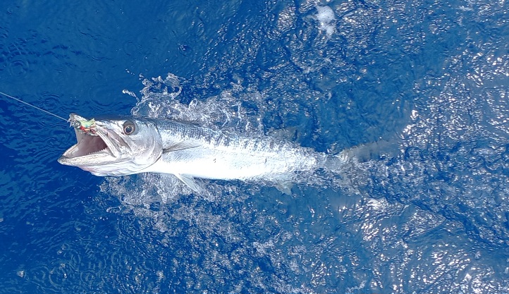 Je traîne un peu la ligne en route : deux beaux barracudas mordent… mais trop près des îles. Risque de ciguatera — je les relâche et je remonte la ligne.