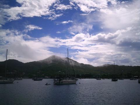 En quittant Prickly Bay, nous parcourons la côte sud poussés par une bonne petite brise. Nous envisagions de passer une nuit au mouillage devant la plage de Grande Anse, (dans la partie autorisée), mais les fonds sont remplis de mates coralliennes et l’ancre est mal posée, la chaîne contourne des blocs. Il est difficile d’envisager de passer une nuit dans ces conditions. Nous changeons d’option et partons au nord de la baie de Saint Georges, sous la pointe Molinière ; là, une des deux bouées de mouillage est libre. Devant ce creux sauvage de la baie, nous voyons les grains se succéder, rendant l’eau sombre et peu accueillante.