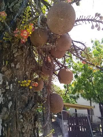 le « Canonball tree », dont les fruits rappellent des boulets de canon, tant par leur forme que par leur poids (entre 5 et 10 kg) ;