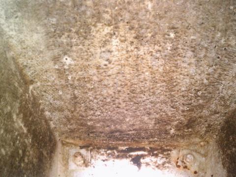 Une fois toutes les trappes ouvertes, nous constatons que les parois à l’air sont couvertes d’un moisi qui part vite à la brosse ou à l’éponge, tandis que de la terre semble déposée au fond.