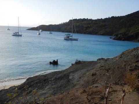 Nous sommes chanceux ! A notre arrivée, les bouées, en fond d’Anse, non loin de la plage sont libres et nous pouvons nous amarrer pour une ultime soirée ensemble. Les trois équipages partent à la découverte de ce mouillage dont le fond de l’anse est de sable doré ; quelques dunes, sur une partie, rejoignent les flancs des hauteurs qui enserrent l’anse.