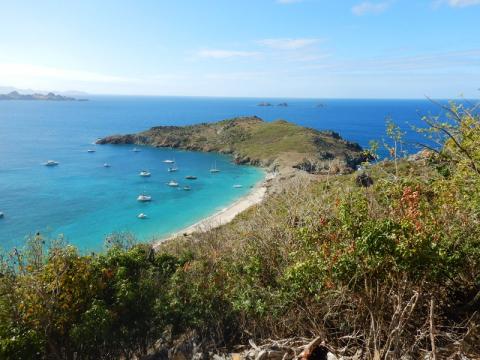 De ce petit col, la vue sur l’Anse Colombier est belle et apaisante ; bien à l’abri de ses pointes qui s’avancent vers le large, l’eau est calme et se pare de teintes variées selon les fonds.