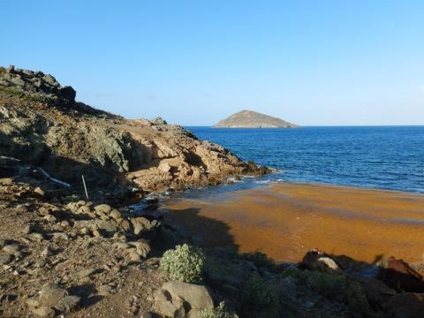 Ici aussi, comme pour la plupart des anses de la partie est de l’île, des étangs et lagunes forment l’arrière-plage. Mais ici, comme son nom l’indique, les marais salants ont été exploités dès 1651, quand l’Ordre de Malte acquit l’île. Les récoltes de sel ont été arrêtées en 1972, façonnant le paysage tant par ses digues orthonormées que par les degrés de couleur de l’eau, rougie par la forte concentration en sel.