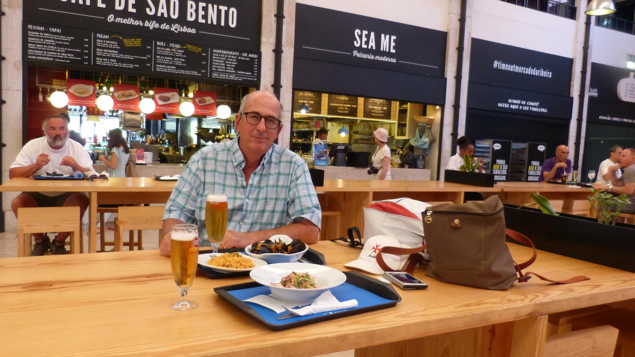 Ce matin, Annie nous quitte. Nous prenons ensemble le train pour Lisbonne où nos chemins se separeront. Un marinero nous emmène à la gare, après le pain frais offert et livré sur le bateau, le service exceptionnel de cette marina est donc confirmé. Tout près de la gare de Lisbonne nous décidons d'aller visiter le marché. À côté de la partie marché classique nous découvrons une grande salle bordée de petits restos. Chacun fait son choix puis s'installe au centre. Original et très agréable. Puis en taxi, car c'est dans la partie la plus haute de Lisbonne, nous rejoignons le Monastère de saint Vincent. Énorme bâtisse couverte d'azuleros dont une belle collection de représentation des fables de La Fontaine et des escaliers à n'en plus finir... A travers les ruelles étroites pavées à la portugaise, nous rejoignons le Château Saint Georges Nous apprécions la visite des jardins sous les arbres (un peu de fraîcheur) et les très belles vues sur le Tage . Pour le chemin de ronde, des marches , encore des marches ! il fait chaud et la fatigue commence à se ressentir. Nous allons à la gare heureux de s'asseoir dans le train déjà en gare. Nous déchantons vite car, contrairement au trajet aller, il ne s'arrete pas à toutes les gares ! Et la notre saute... Descente à la suivante et à nouveau 25 mn de marche. Ouf voilà le bateau et une bonne douche.